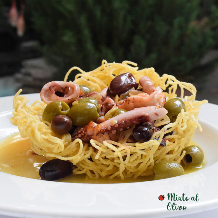 Pulpo, calamar y camarón a la parrilla con aceite de oliva extra virgen, ajo y aceitunas.